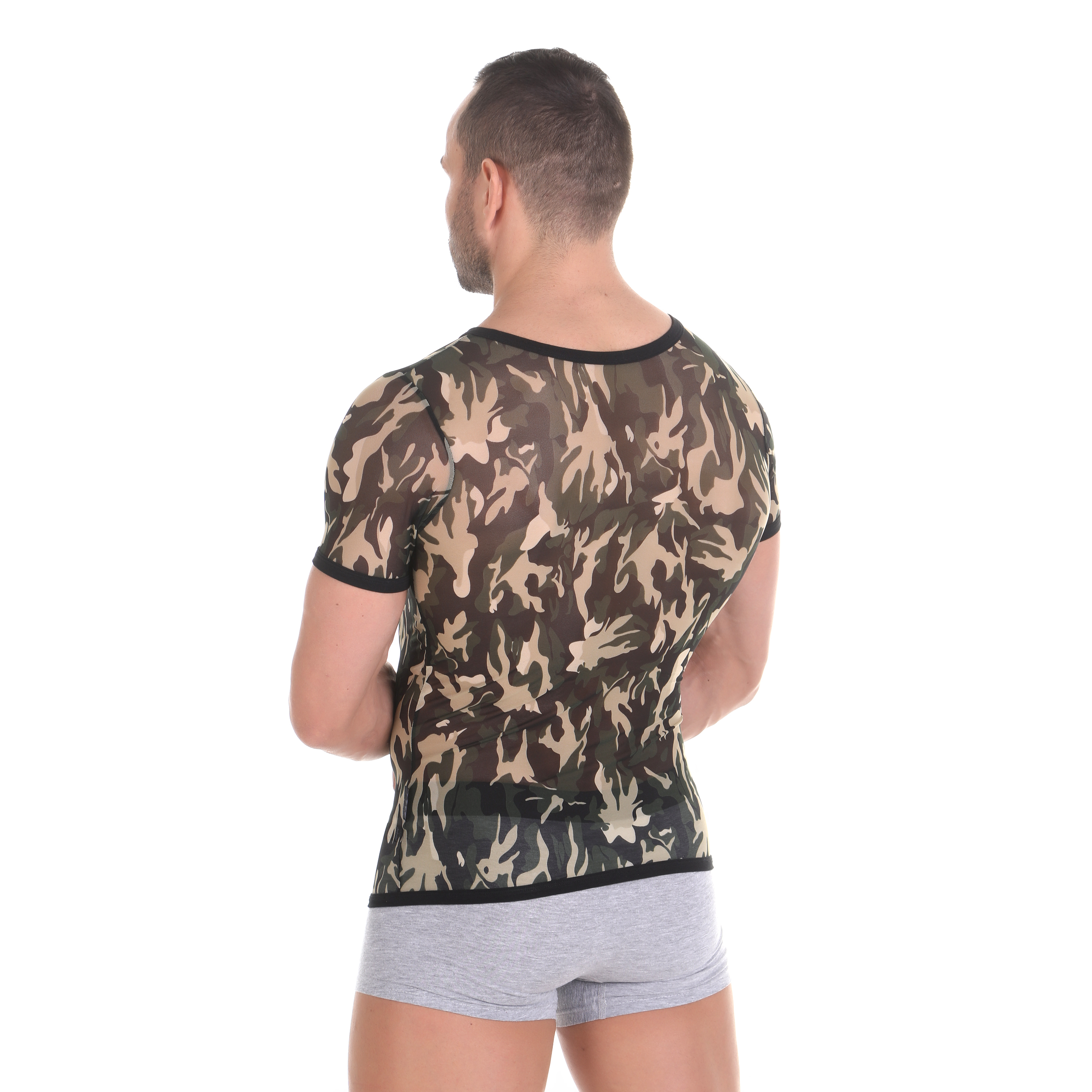 Классическая футболка с V-образным вырезом из сетки с принтом хаки. Швы с комфортной обработкой, эластичное полотно сетки очень приятное к телу.
