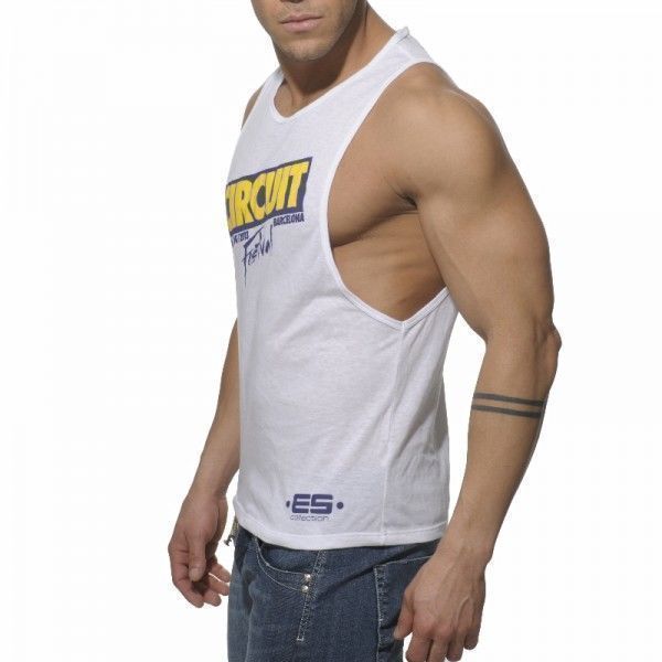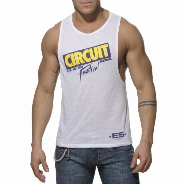 Мужская майка белаяс круглым воротом, изготовленная из хлопка с добавлением спандекса с винтажным принтом Circuit Festival. Идеально подходит для занятий спортом, отлично подчеркивает подчеркивает достоинства атлетической фигуры.
