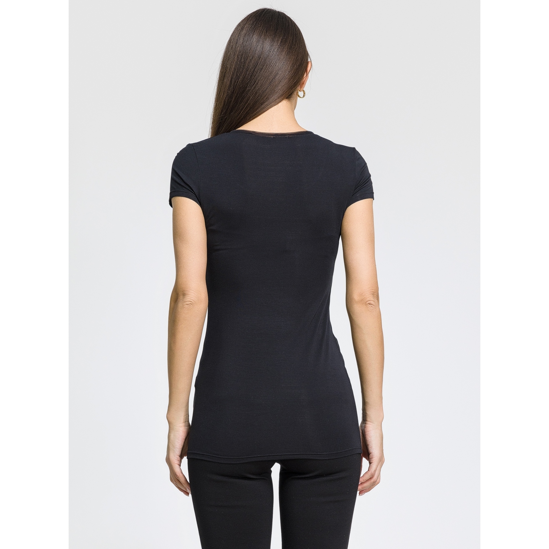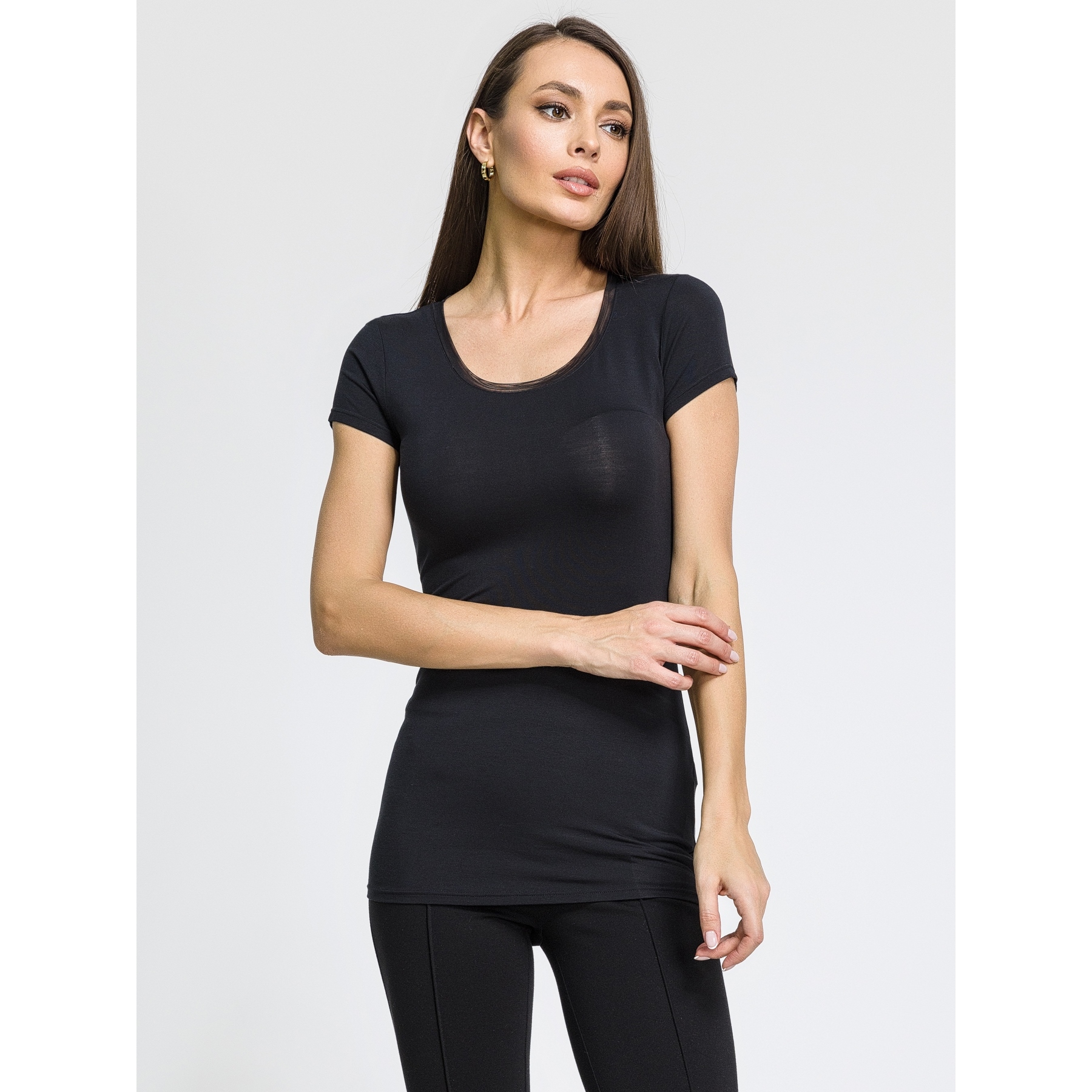 Футболка женская с короткими рукавами, с круглым вырезом, который обработан деликатно мягкой вставкой из полупрозрачного тюля (капрона). ,Футболка изготовлена из гладкого мягкого нежного эластичного модала натурального происхождения премиального качества (вискозного шелка). ,