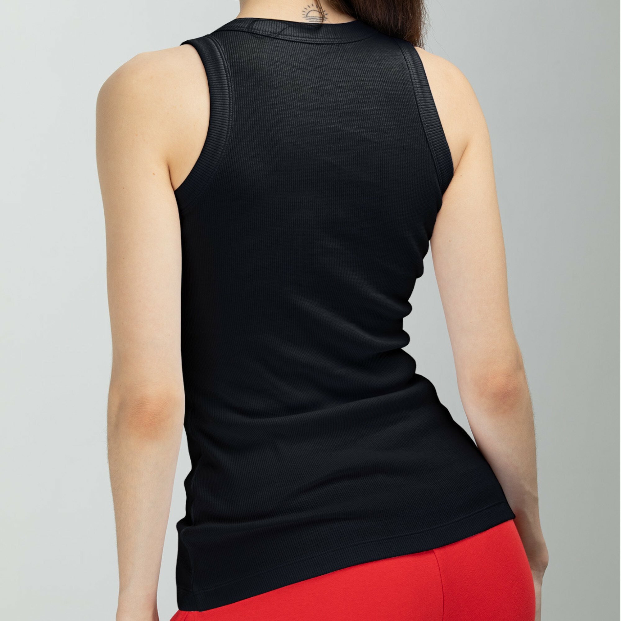 Женская базовая майка с американской проймой, в мелкий рубчик. Это идеальный вариант для жаркого лета и отличный нижний слой в межсезонье. Трендовый силуэт майки делает её необходимым предметом в каждом гардеробе.